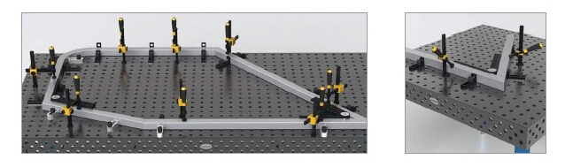 角度器可連續(xù)調(diào)節(jié)0°~180°之間的任意角度,從側(cè)面圓盤刻度上讀數(shù),當(dāng)調(diào)節(jié)到所需要的角度時(shí),擰緊側(cè)面的夾緊螺絲即可。兩夾角臂上分別有系統(tǒng)孔和槽,可以在孔和槽中連接其他定位夾具模塊用于定位或夾緊。